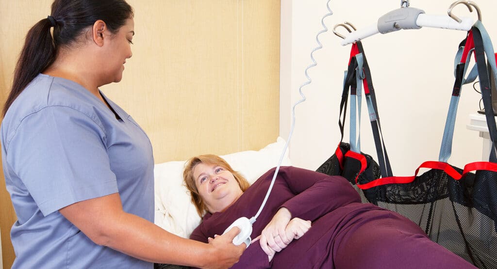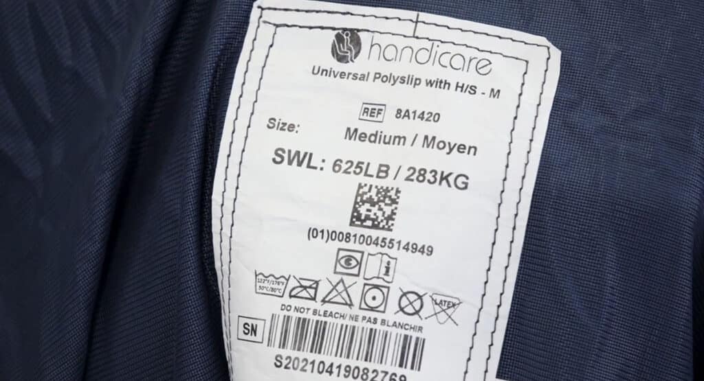 Prior to sling application, the caregiver needs to check the sling to ensure it is the correct sling style, and size for the patient or resident. The caregiver also needs to ensure the individual does not exceed the sling’s safe working load (SWL).