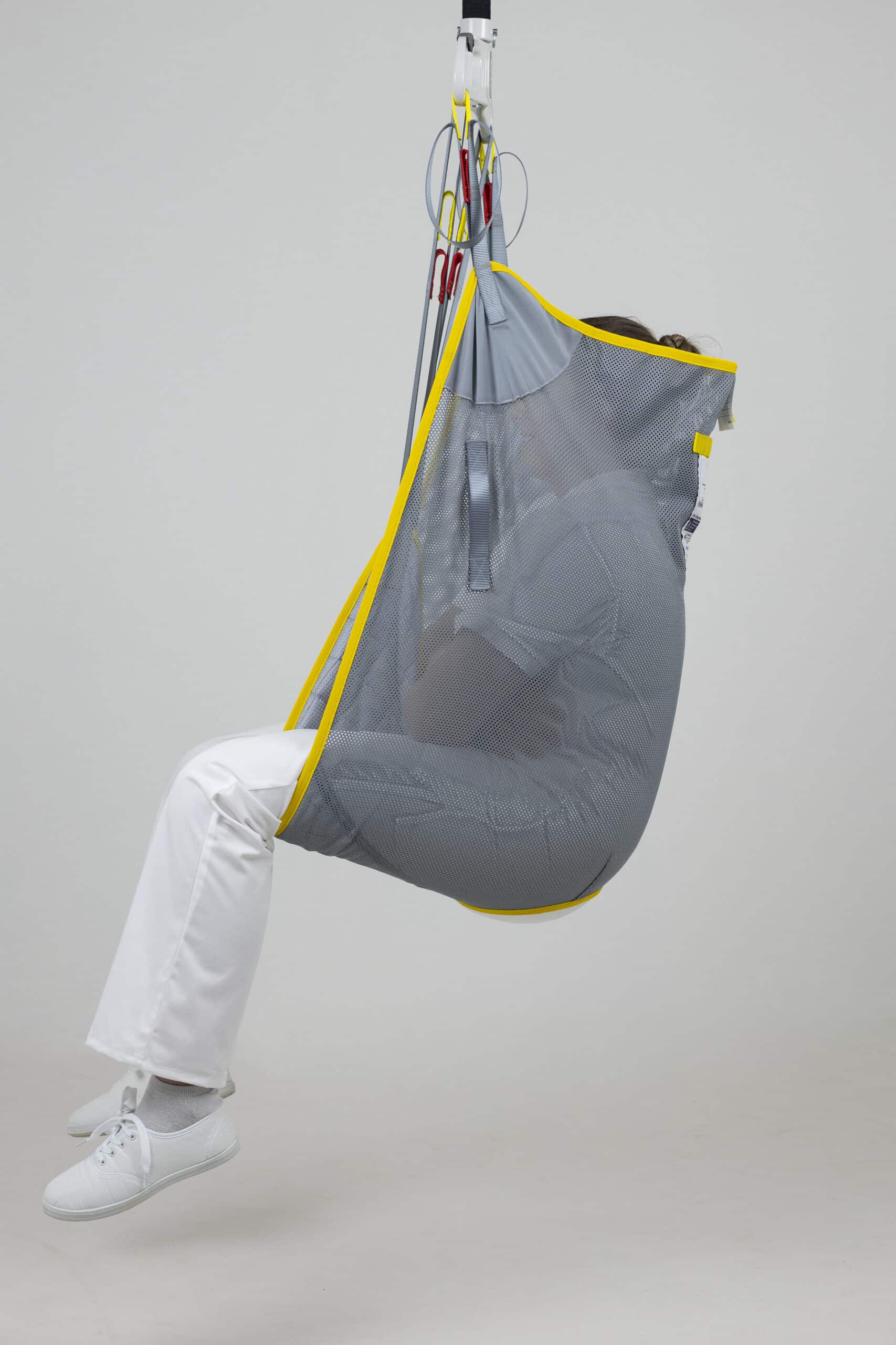 The Universal with Head support sling offers full body and head support.  It is ideal for general transfers and can be used to lift from a supine position.