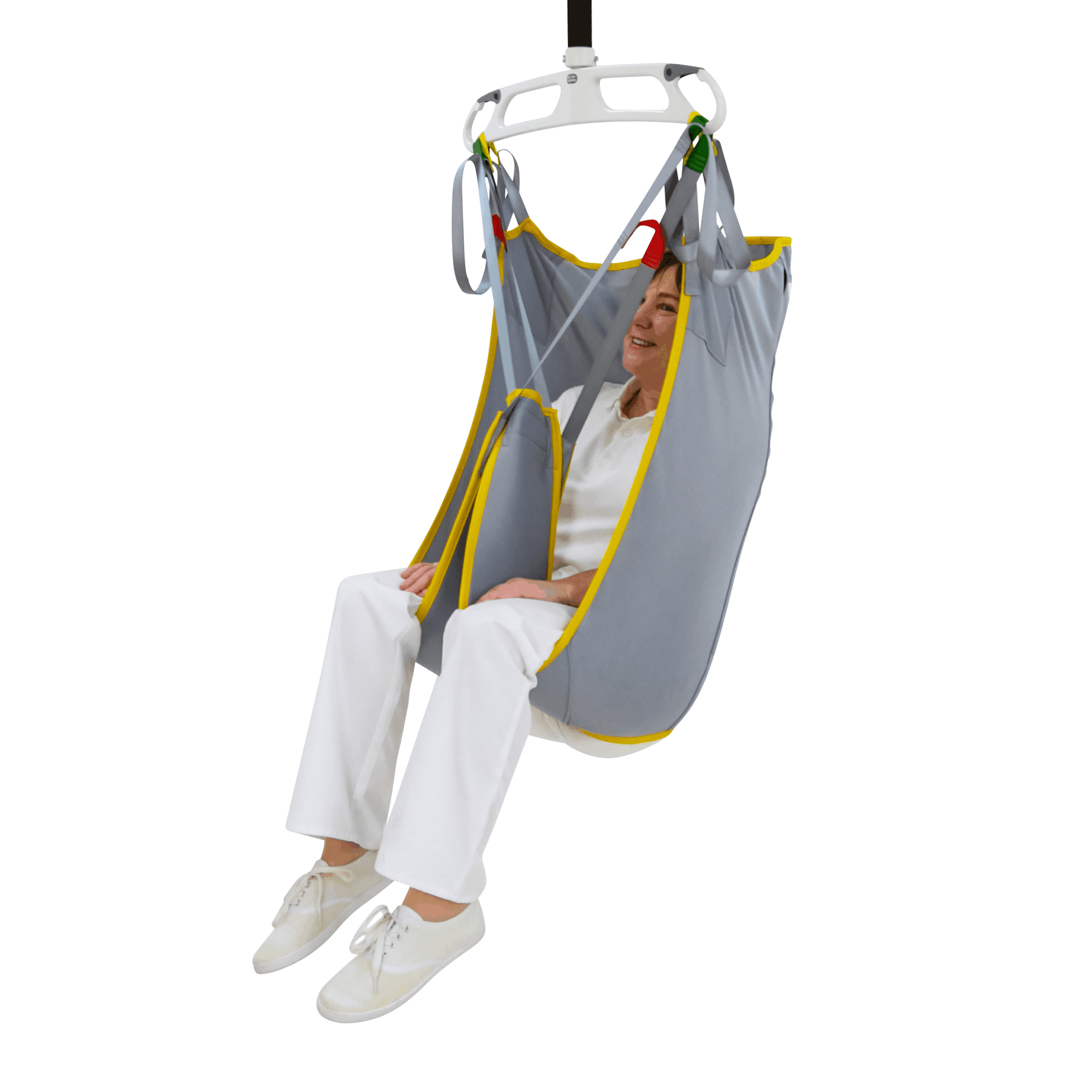 Universal High Back Sling offers full body and head support. It is ideal for general transfers and can be used to lift from a supine position. Available in polyester or polyester mesh, with full-length boned back support and firm foam leg supports.